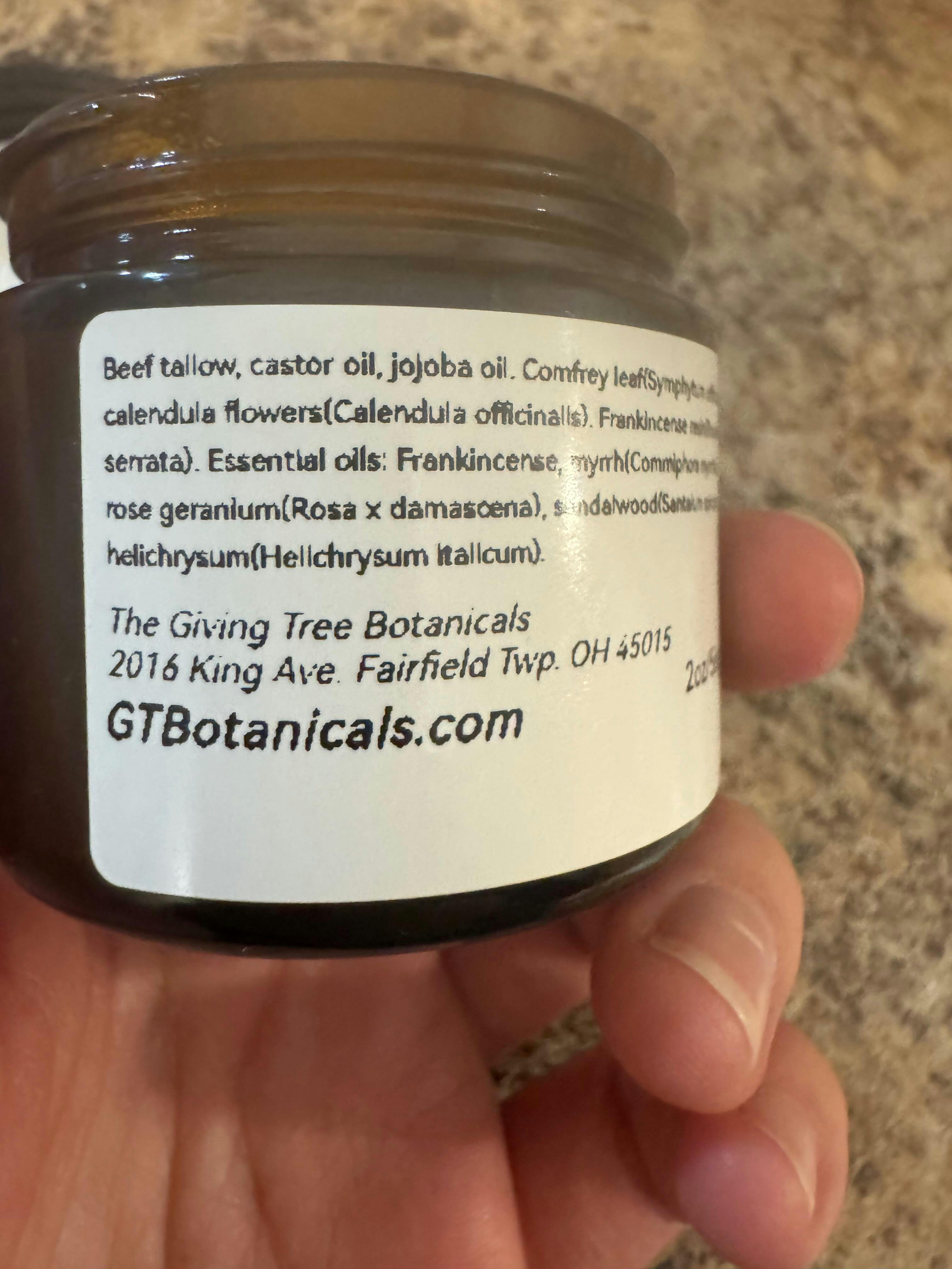 Ingredients: Castor, & olive oil, beef tallow. Comfrey leaf(Symphytum officinale), calendula flowers(Calendula officinalis), Frankincense(Boswellia serrata), myrrh(Commiphora myrrha) resin. Essential oils: frankincense, myrrh, sandalwood(Santalum album), helichrysum (Helichrysum italicum), geranium(Pelagonium graveolens).