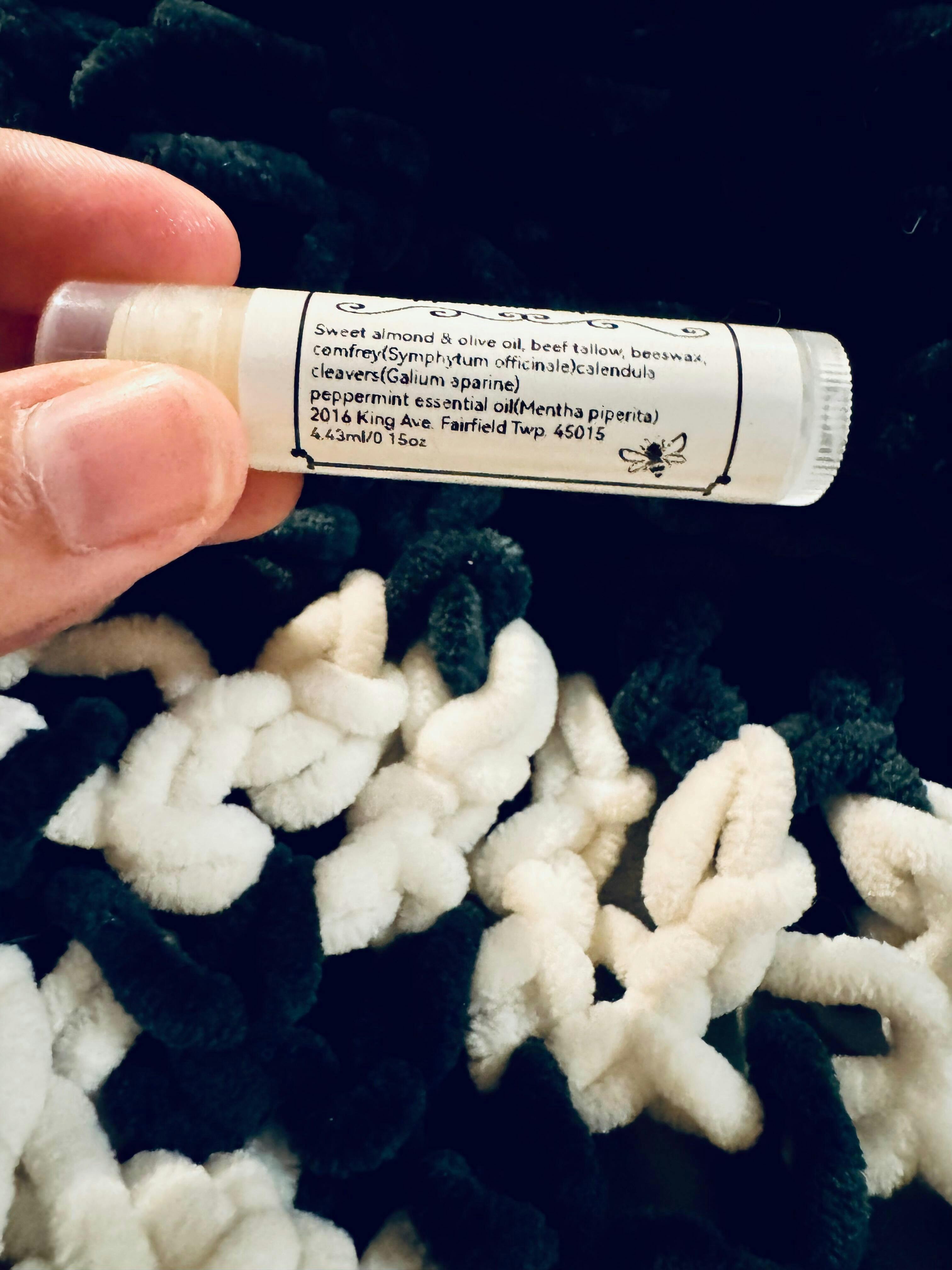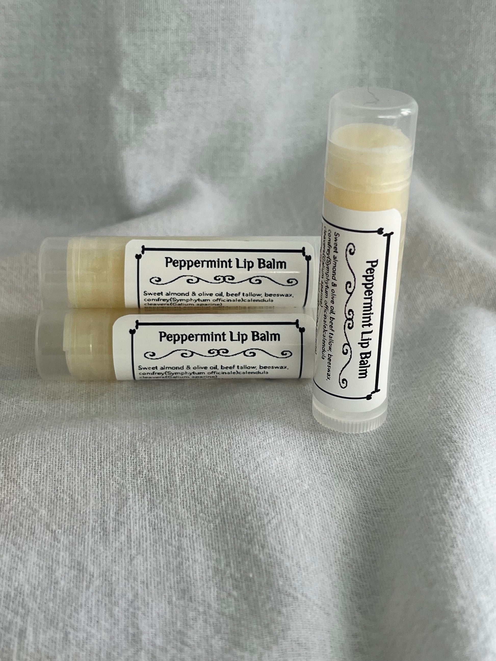 Ingredients include: beef tallow, beeswax, jojoba & olive oil. Comfrey leaf (symphytum officinale), calendula flowers(Calendula officinalis), peppermint essential oil (mentha x piperita).