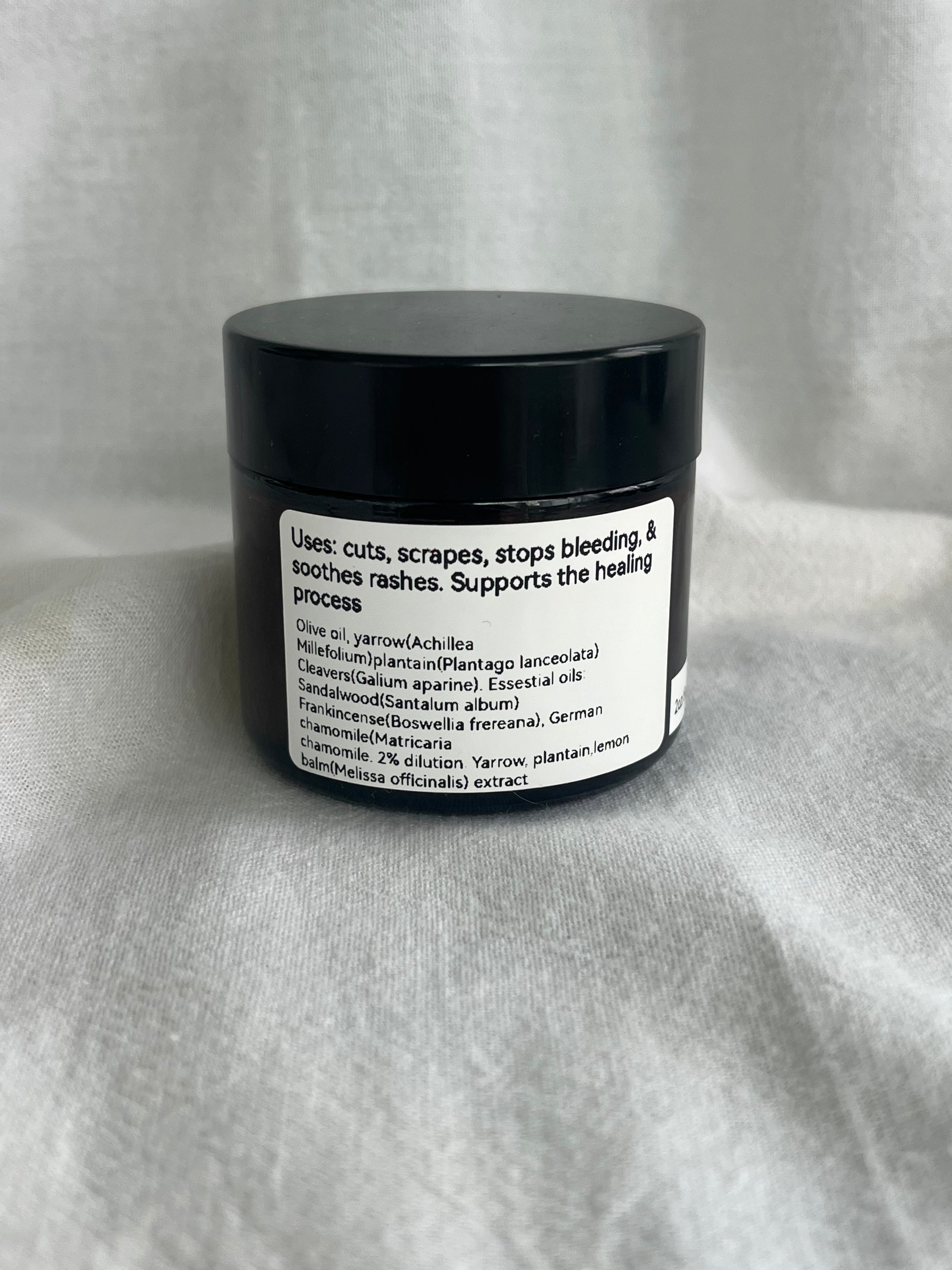 The yarrow salve has numerous beneficial properties to aiding in someone's health. Good for cuts, scratches, scrapes, bumps, and bruises! It helps stop bleeding and soothes rashes while supporting the healing process.